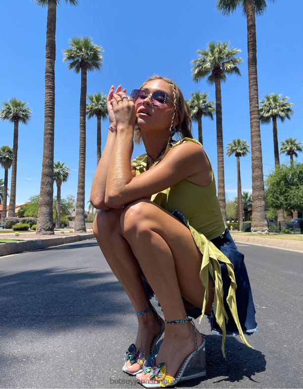 влезете в модата с нашите очарователни прозрачни клиновидни токчета Kynlee. украсата с пеперуди с мъниста върху каишката на пръстите добавя магическо докосване, докато прозрачната пета осигурява модерно елегантно повдигане.
