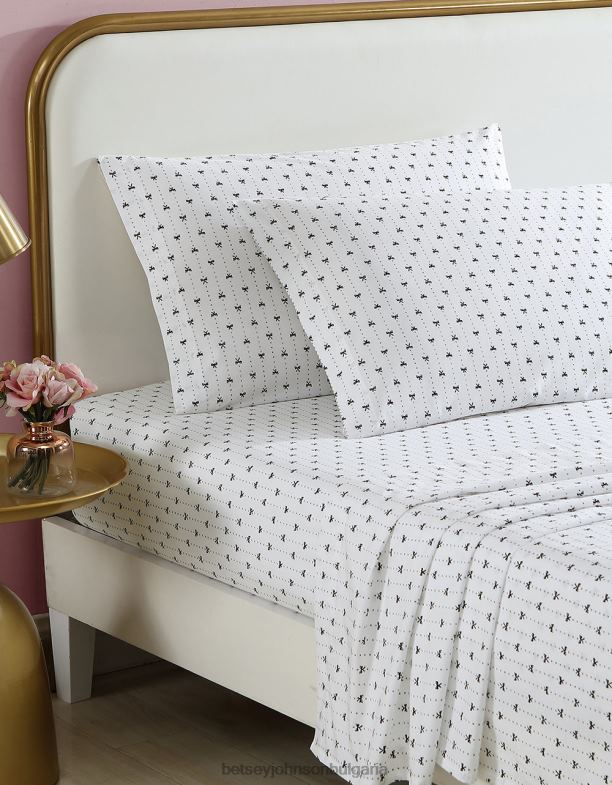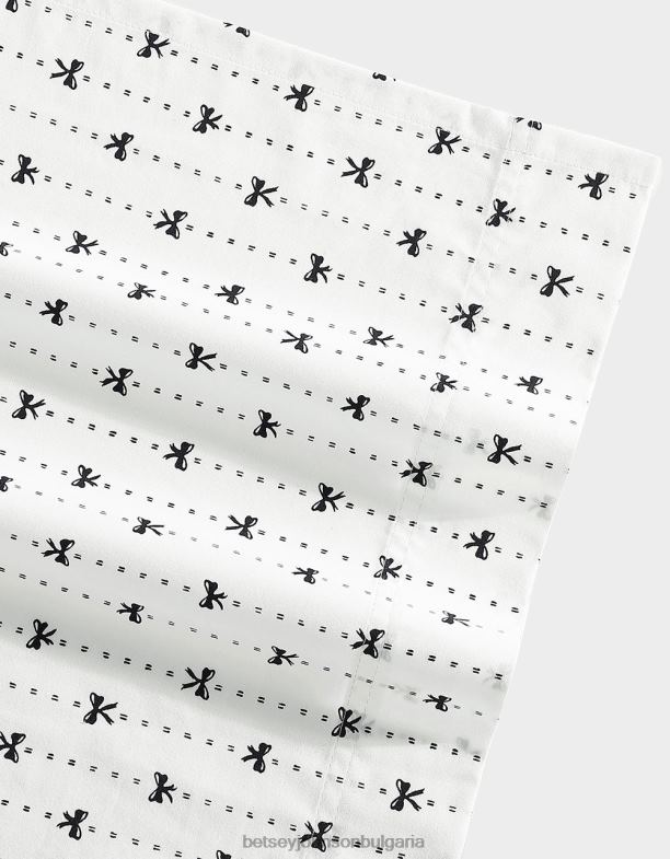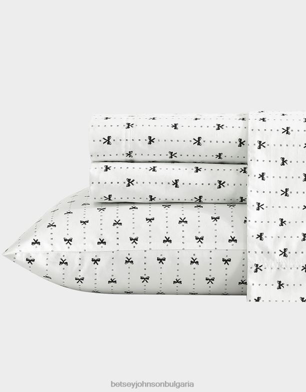 Декорът на ленти с лента Betsey Johnson включва линейни ивици, направени от деликатни панделки в черно върху бяла основа. изработени от 100% памук, лесни за поддръжка. нишките са изтъкани в плътна тъкан, за да осигурят гладкост на всички комплекти. еднослойните листове са изтъкани, за да бъдат леки, но издръжливи. те са изградени с тъкан от перкал за хладно усещане, използвайки 200 нишки. всеки комплект включва плосък чаршаф, еластичен чаршаф и 2 калъфки за възглавници. (1 за двоен размер).