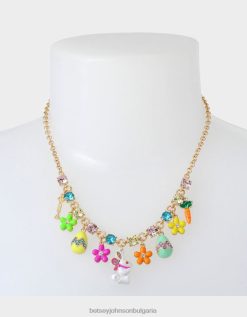 изтънчено колие с верижка с цветни пастелни камъни и игриви смесени талисмани отпред, включително; зайче, яйца, морков и цветя. колието има регулируема закопчалка тип омар. изработени от полиран метал, стъкло, изкуствена перла и пластмаса.
