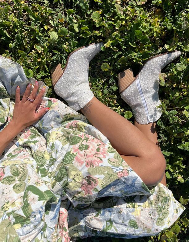 влезте в тази епоха, вдъхновена от уестърна, със самочувствието на дива, украсена с бляскавите западни ботуши с кристали перли . танцувайте на музиката и движете краката си в ритъма по време на този фестивал и концертен сезон, демонстрирайки стила си с тези забавни бели ботуши.