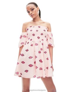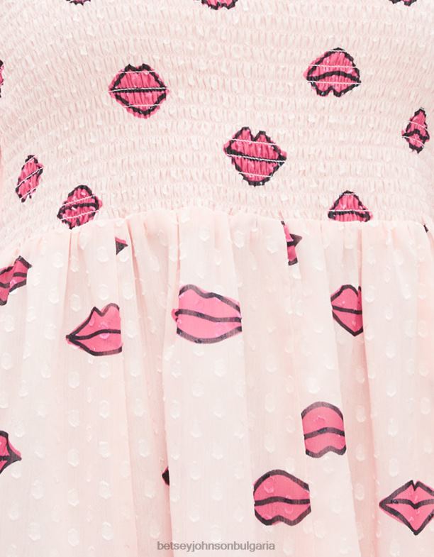 набръчкайте се в тази закачлива мини рокля с отворени рамене. с принт на цяла целувка и е изработен от пушена материя, която се разширява в талията. идеален за добавяне на закачлива нотка към всеки ансамбъл.