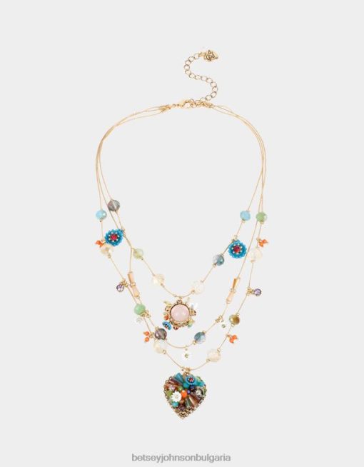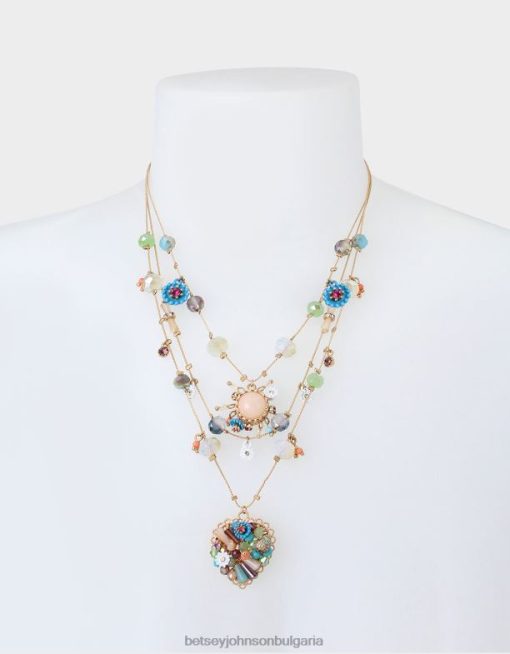 многоцветни мъниста украсяват прекрасната многослойна огърлица на Betsey в стил илюзия. украсено с талисмани с цветя и кристали, то е изработено от смесен метал в античен златист тон.