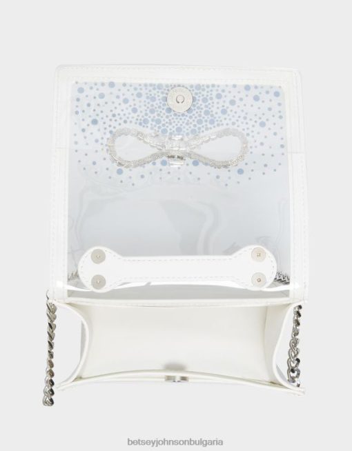тази прозрачна дамска чанта е идеална за изявление без компромис със стила. прозрачният pvc материал е подчертан от искрящи кристали за допълнителна нотка на блясък.