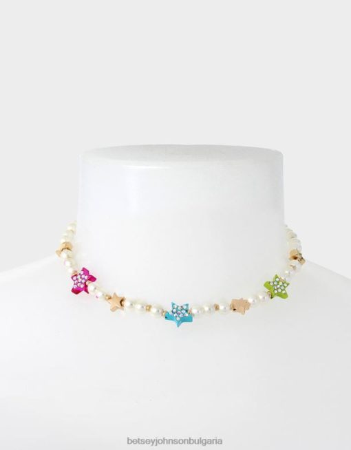 деликатно колие с яка с перлени нишки, включващо цветни смесени звезди, украсени с минимални каменни акценти. колието има регулируема закопчалка тип омар. изработен от полиран метал, стъкло и изкуствена перла.
